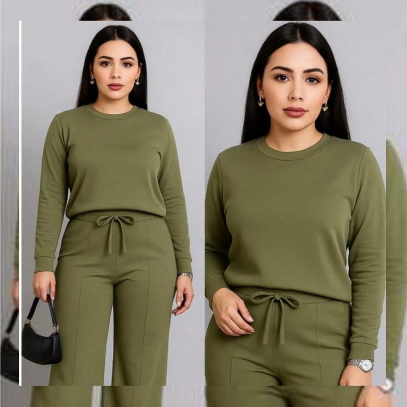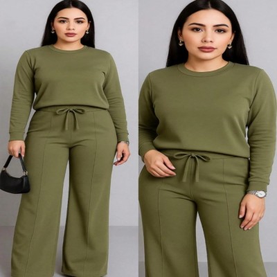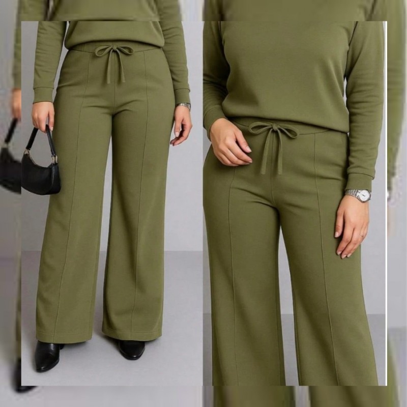 Traje 2 piezas casual de otoño que incluye blusa corta holgada y pantalones pierna ancha tipo pata elefante amplios y cordón en la cintura tela sin transparencias