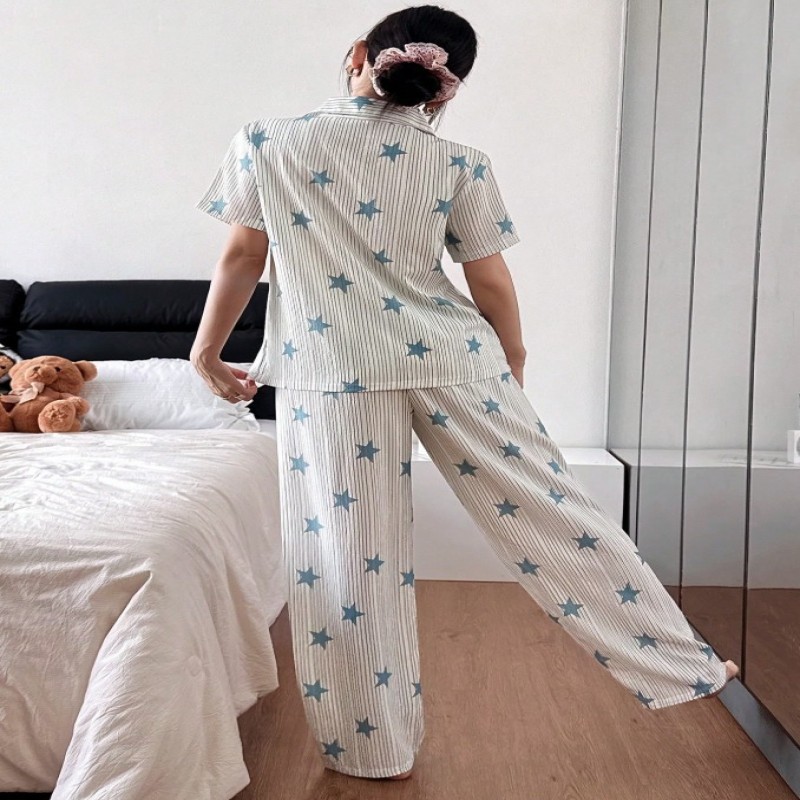 47540 SHEIN Conjunto de pijama de mujer con cardigan casual de solapa con estampado de estrellas y rayas $ 47540 |
