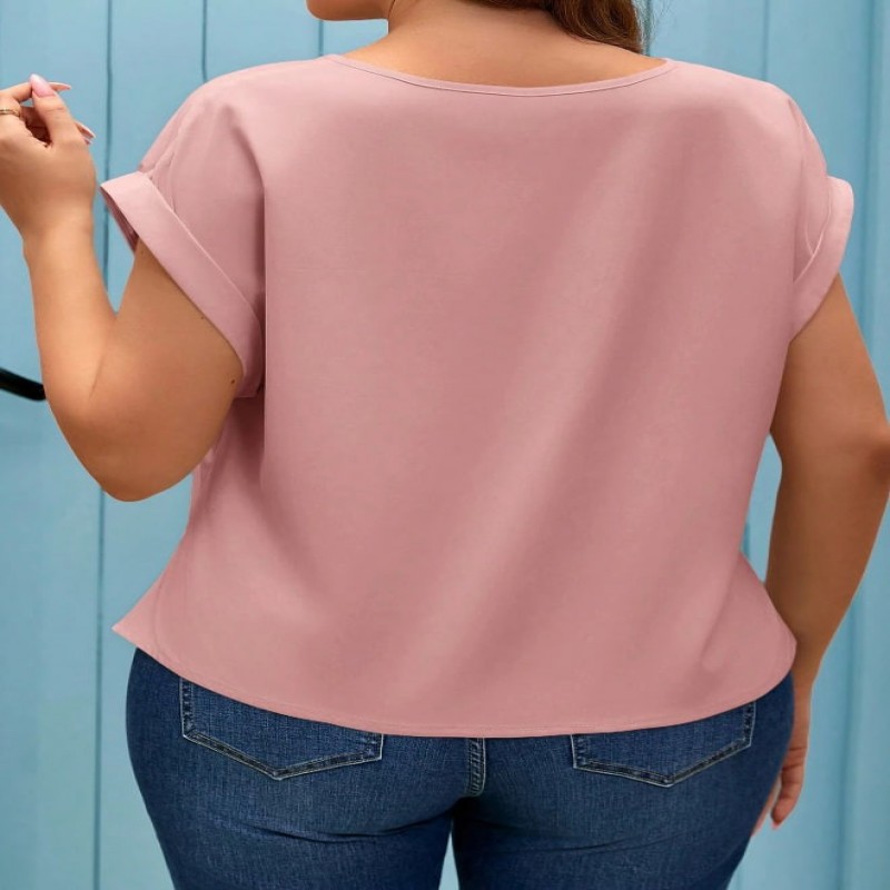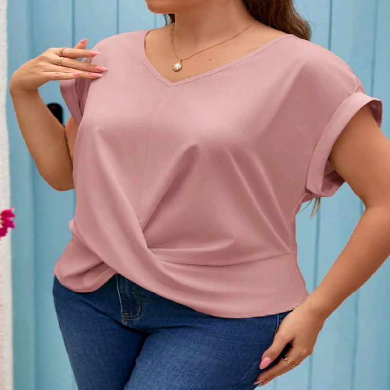 SHEIN Frenchy Camisa verde de talla grande para mujer con cuello en V, mangas cortas tipo murciélago
